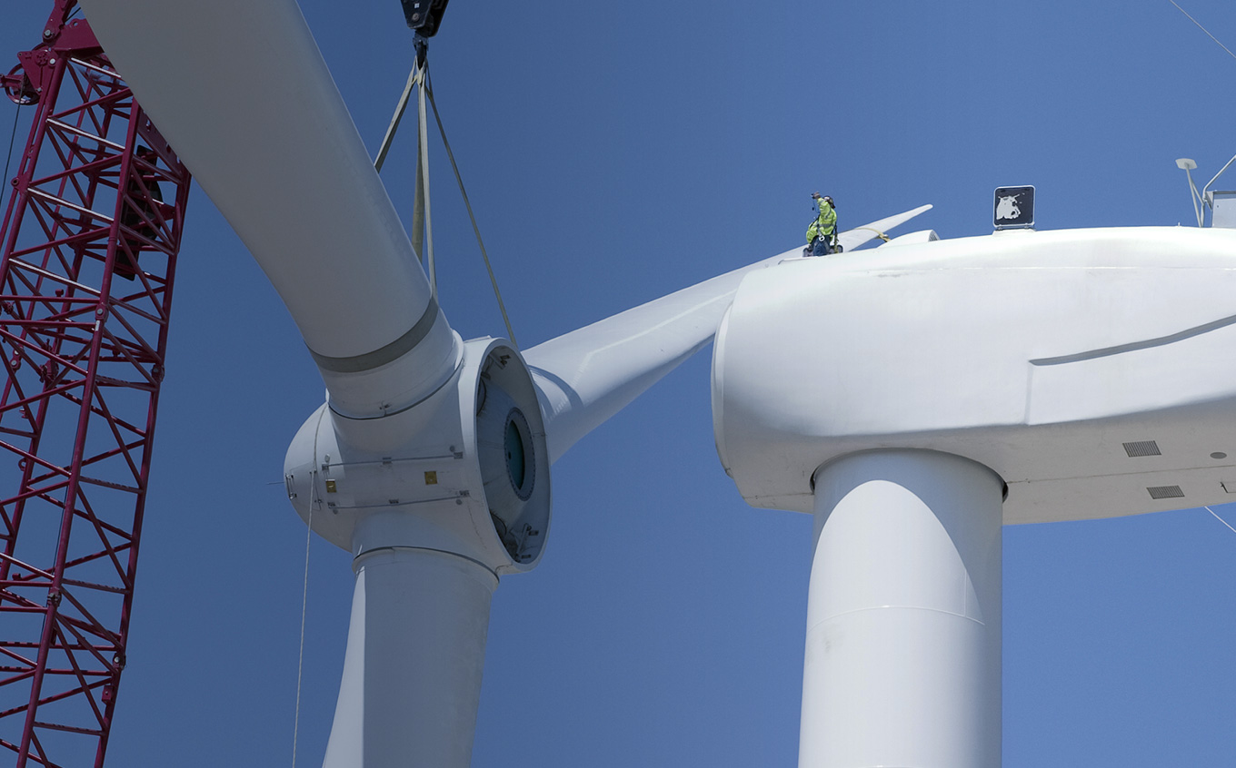 直驅永磁風力發電機取消了沉重的增速齒輪箱,發電機軸直接連接到葉輪軸上,轉子的轉速隨風速而改變,其交流電的頻率也隨之變化,經過置于地面的大功率電力電子變換器將頻率不定的交流電整流成直流電,再逆變成與電網同頻率的交流電輸出。其主要部件包括:葉輪葉片、輪轂、變槳系統、發電機轉子、發電機定子、偏航系統、測風系統、底板、塔架等。其優點有電網兼容性強、維護成本低、噪音低等,但運輸和吊裝難度大。